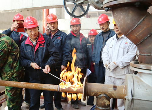 11月9日上午10点08分,我公司硫酸钾生产线漫海姆炉一次点火成功,开始烘炉,它标志着我公司年产10万吨硫酸钾工程竣工,进入试车阶段。图为公司常务副总经理赵鹏程为漫海姆炉点火。