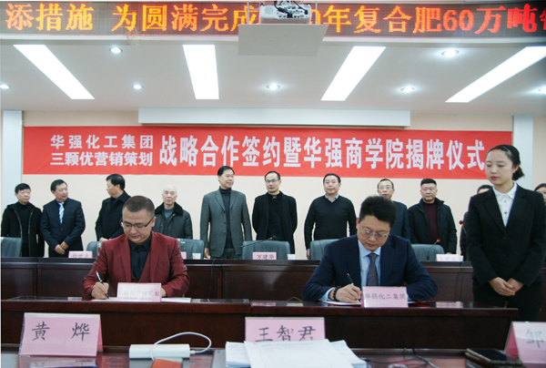 我公司副总经理、销售公司总经理赵迎春和三颗优营销策划公司总经理王智君共同为“华强商学院”揭牌,并为王智君、谢磊、邹刚、黄烨颁发“华强商学院”讲师聘书,标志着“华强商学院”正式成立。随后,营销员代表国成龙和磷复肥分公司总经理张华斌分别上台,表达了销售公司坚决完成2020年销任务的决心。