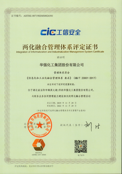 近日,我公司顺利通过国家两化融合管理体系认证,获得两化融合管理体系评定证书,成为符合 GB/T23001-2017 标准的国家级两化融合管理体系贯标企业,标志着华强化工在推进“信息化和工业化”深度融合方面进入了一个新的阶段。